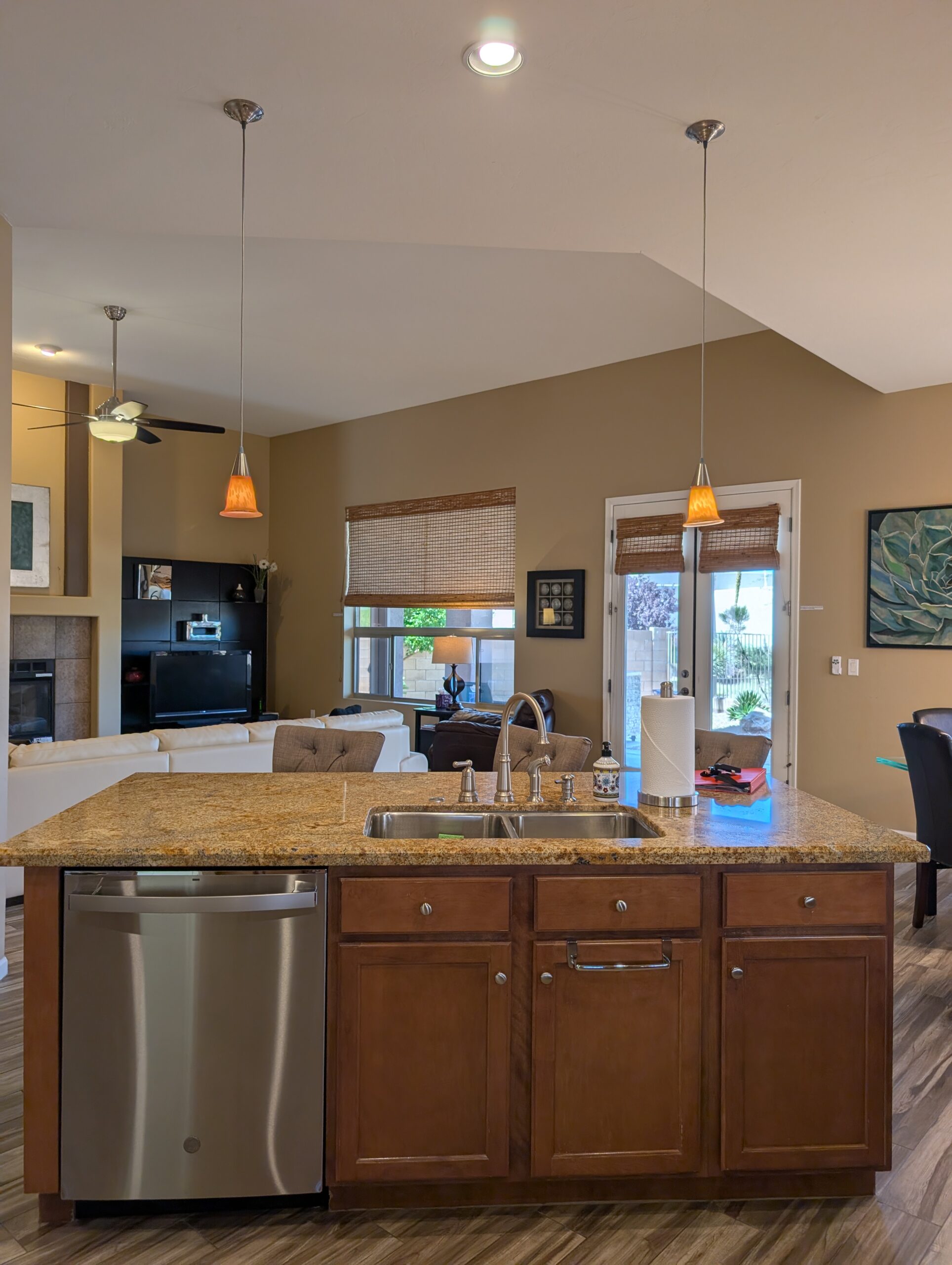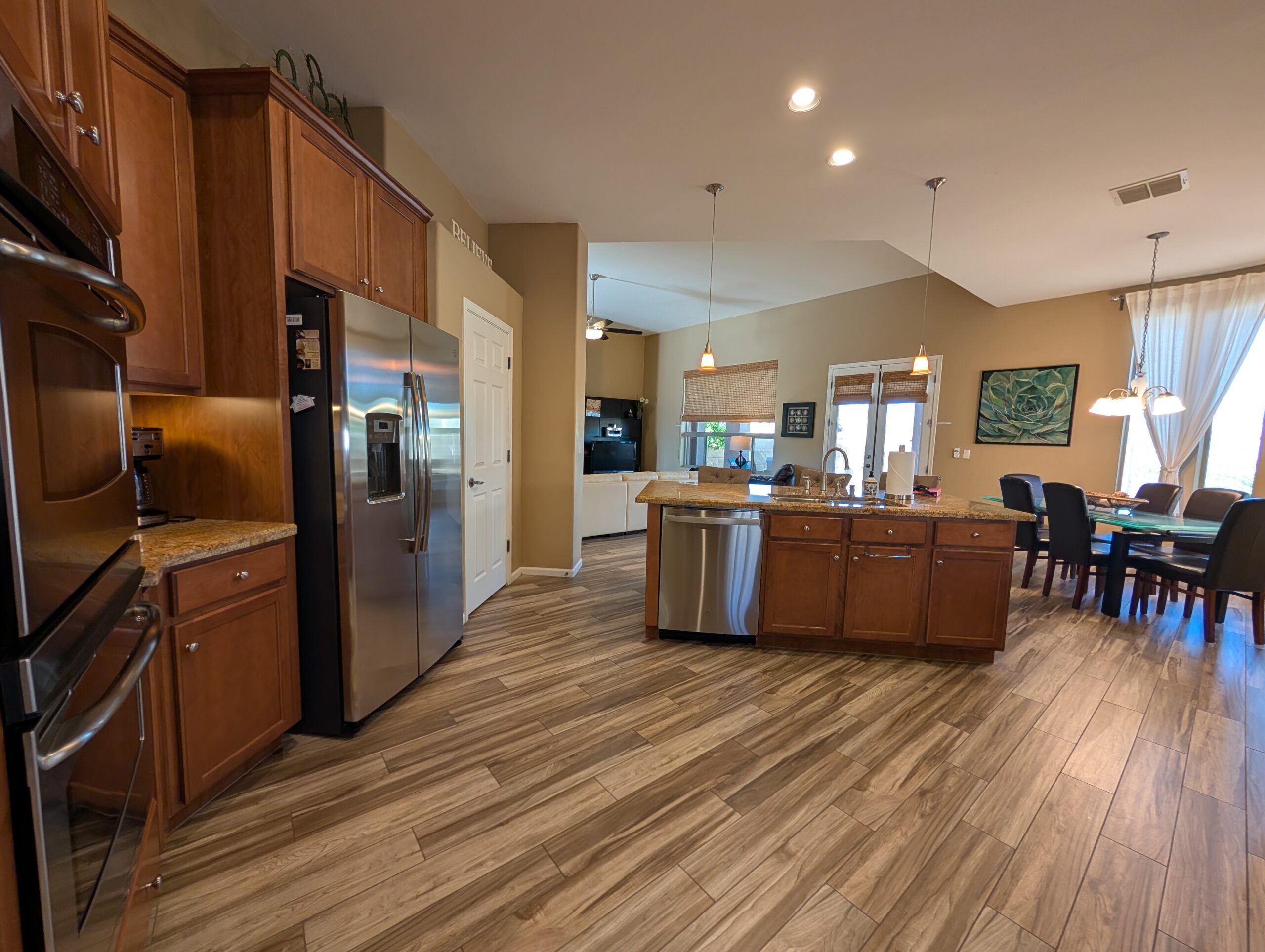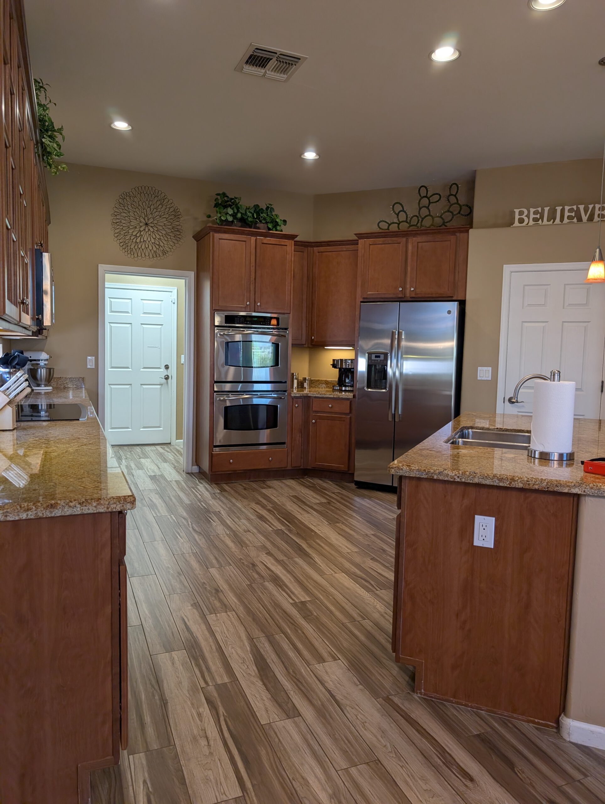 Description: fully furnished 2038 sq ft 2 Bedroom + Den, 2 Bath. This home features gourmet kitchen with granite counters, GE Profile stainless steel appliances, DBL ovens, smooth electric cook top stove, kitchen is fully stocked with dishes, glasses, pots, silverware, coffee pot, blender, mixer and much more for you and your guests.