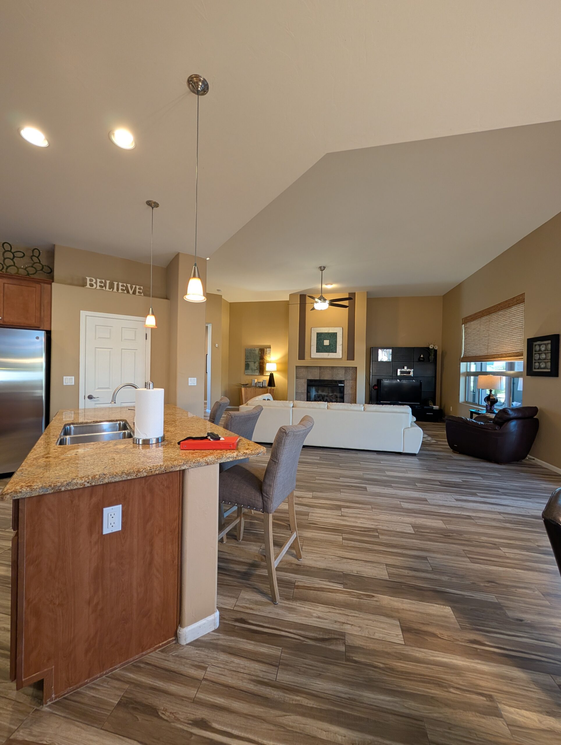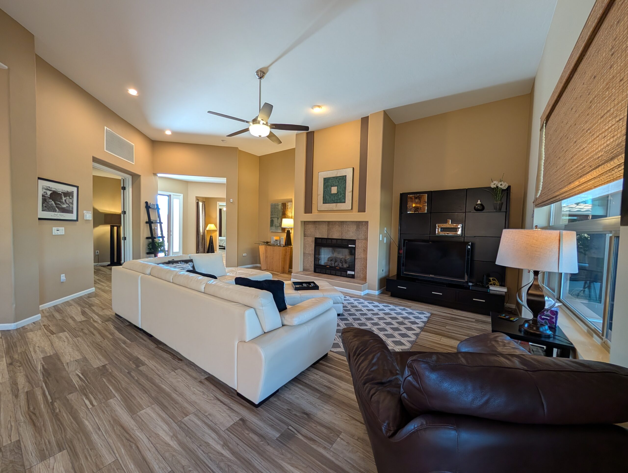 Great room contains leather sectional sofa with ottoman, over sized armchair in modern decor and 42 inch flat screen TV. Gas fireplace in Great room.