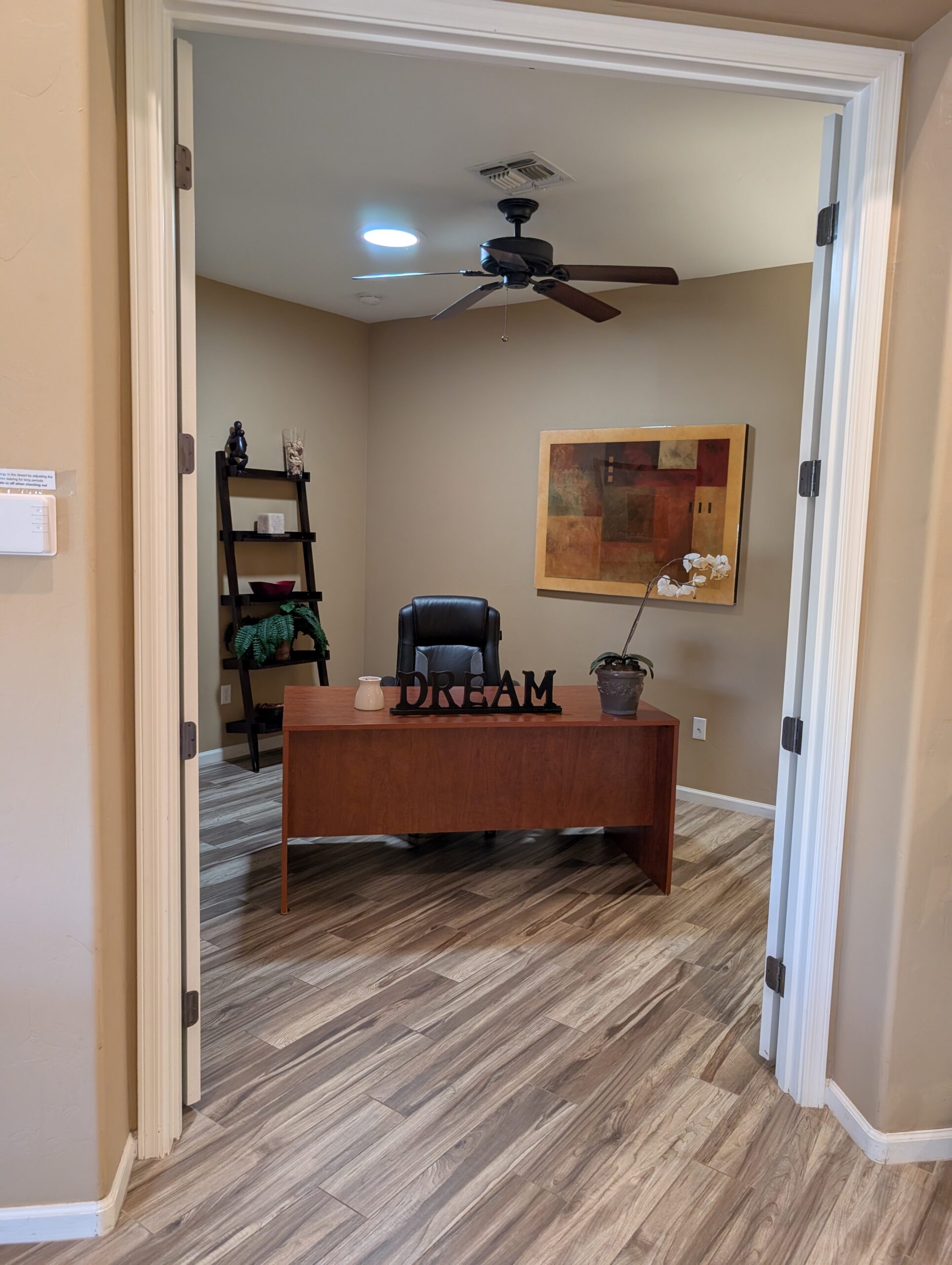 Den is furnished with desk and chair, great for home officing.