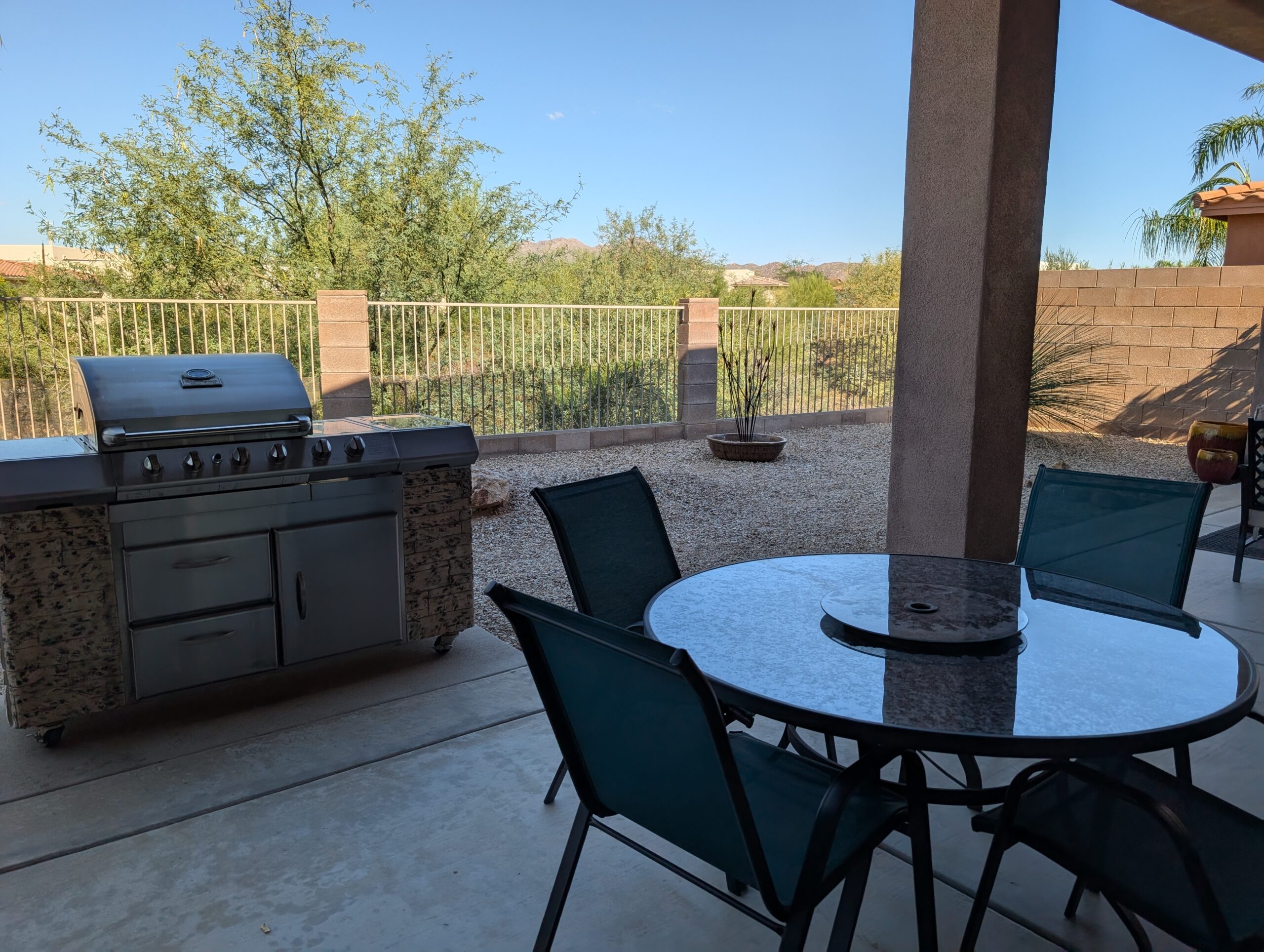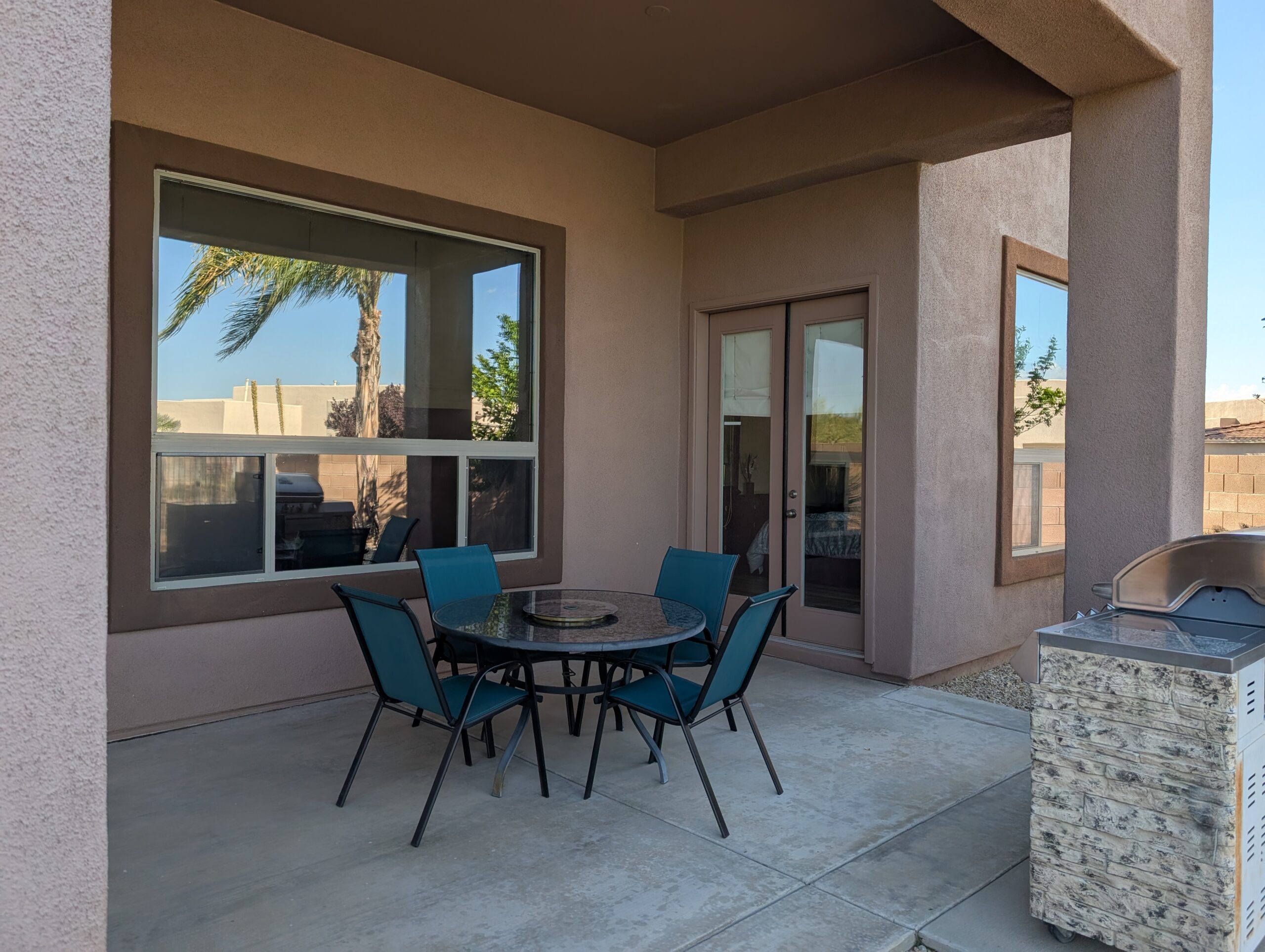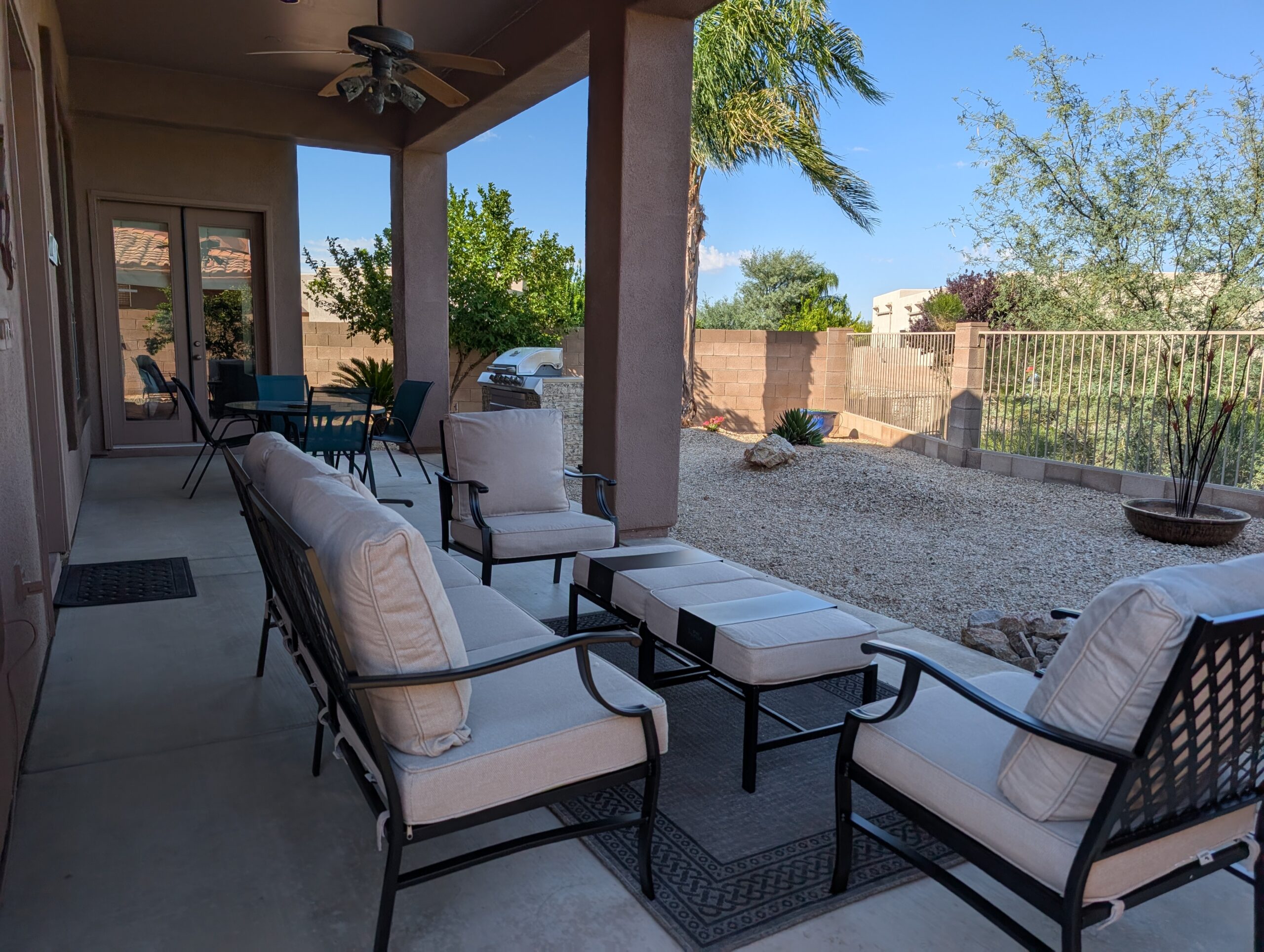 Outdoor patio has a sectional sofa, dining table that seats 4 and a Gas grill.