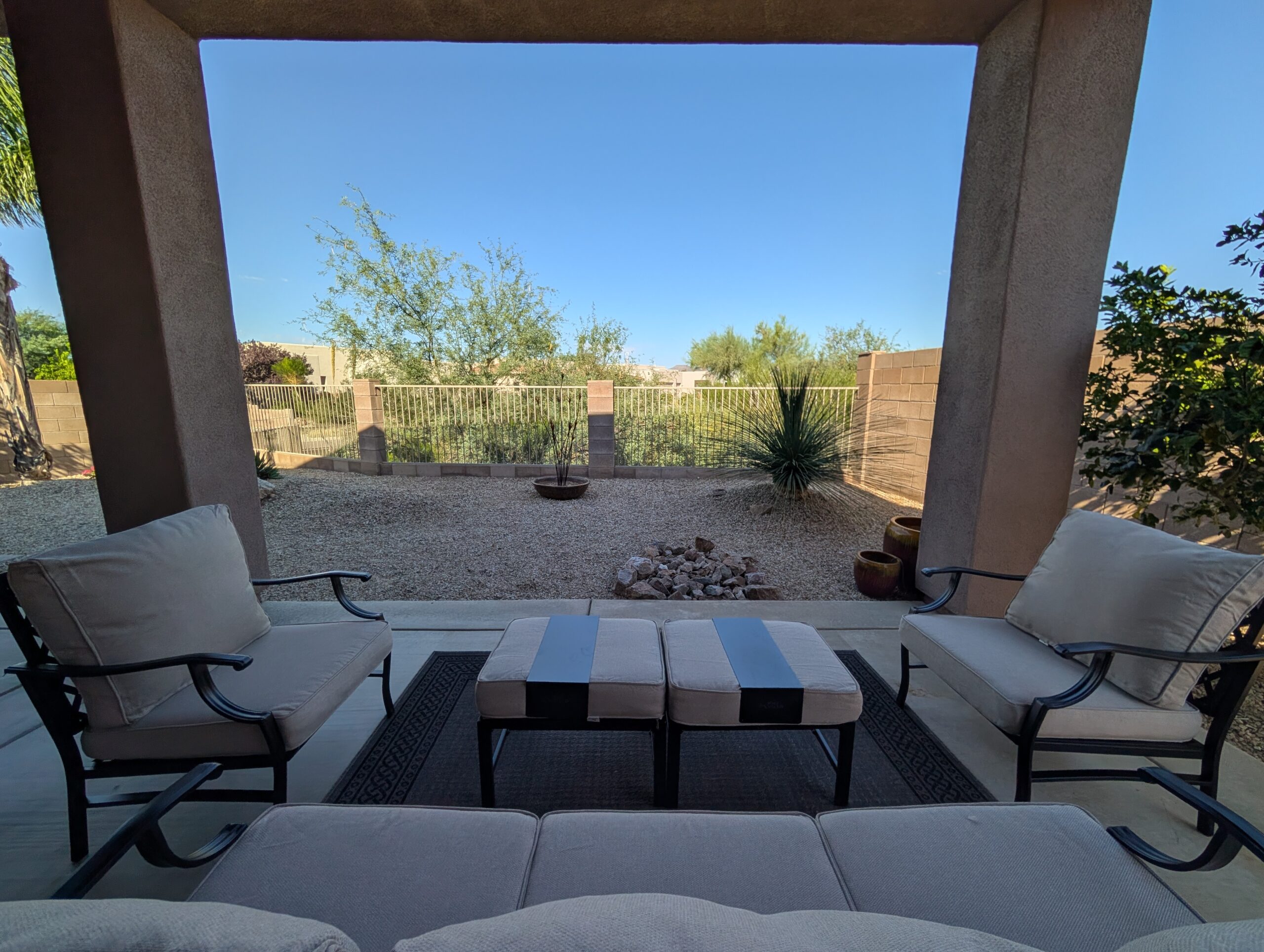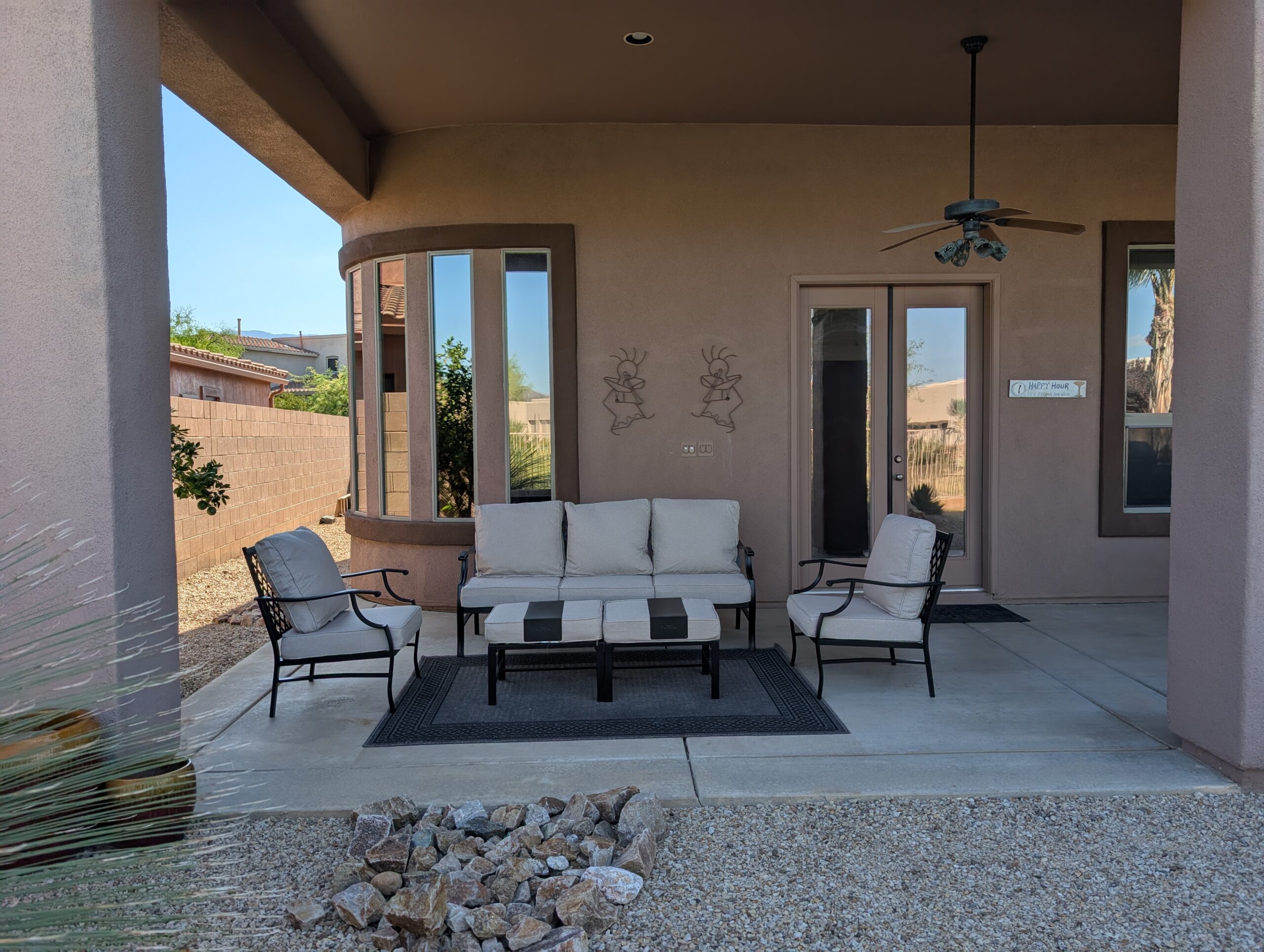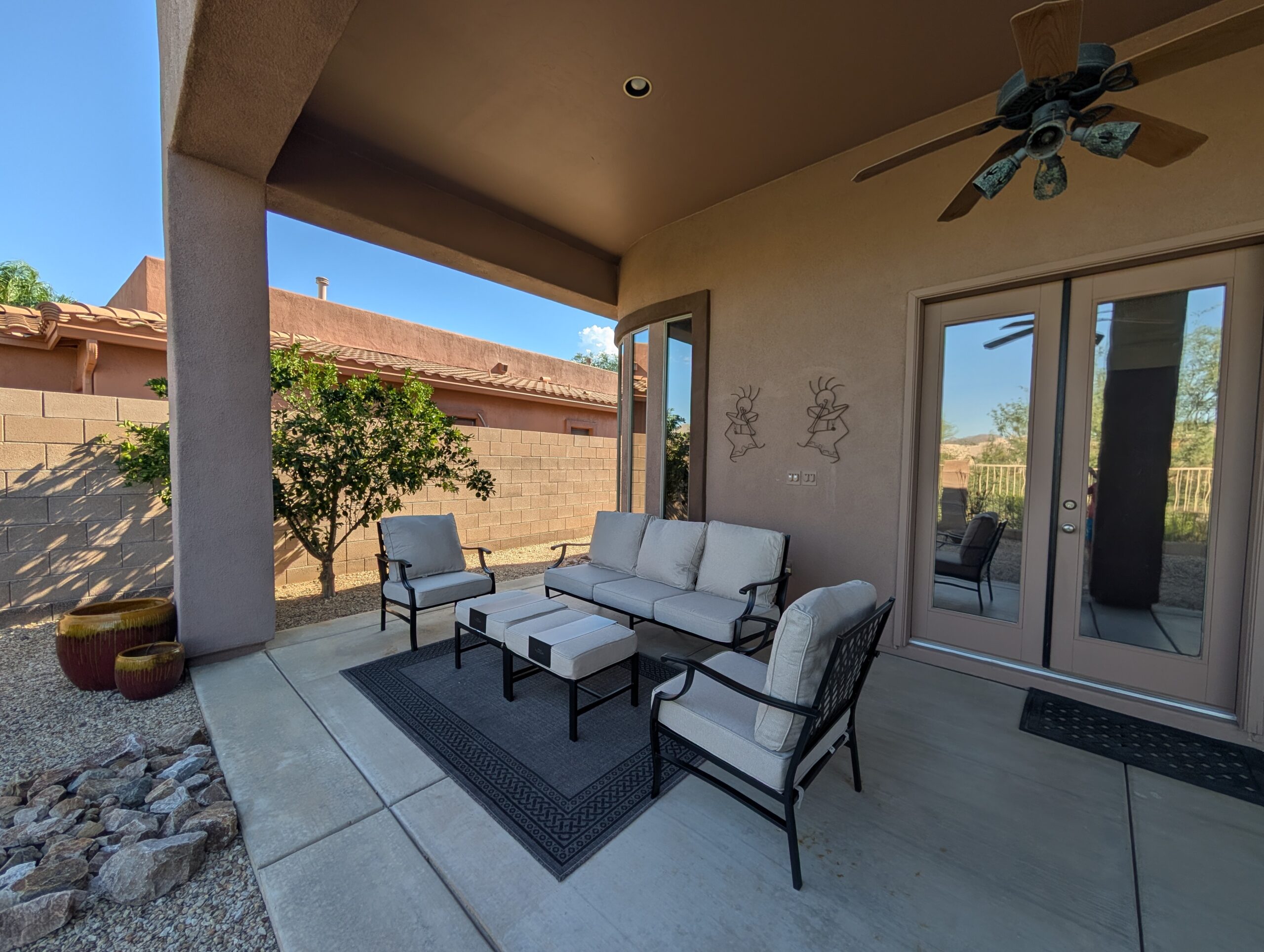 Outdoor patio has a sectional sofa, dining table that seats 4 and a Gas grill.